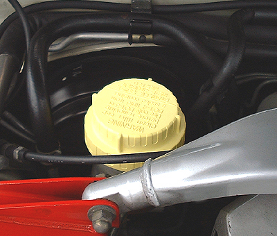 マスターシリンダーキャップを装着した画像です。裏にある類はオリジナルのモノを転用します。キャップ頂部に書かれている注意書きは純正と全く同じです。 |