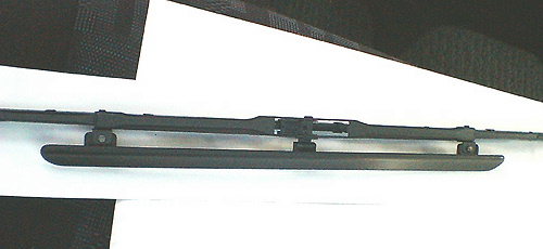 ちょっと見にくい画像で申し訳ありません。これが純正フィン付きワイパーの画像です。後述するが、フィンはL型ステーを利用して両端はかしめ止めされていて、中央部ははめ込まれている。 ![]() ↑裏側↑ ↓表側↓ ![]() 純正との比較の画像、画像右端を合わせて撮影し、左側に長さの差があるのが解りますか?25ミリなんてこんなモンです。 |